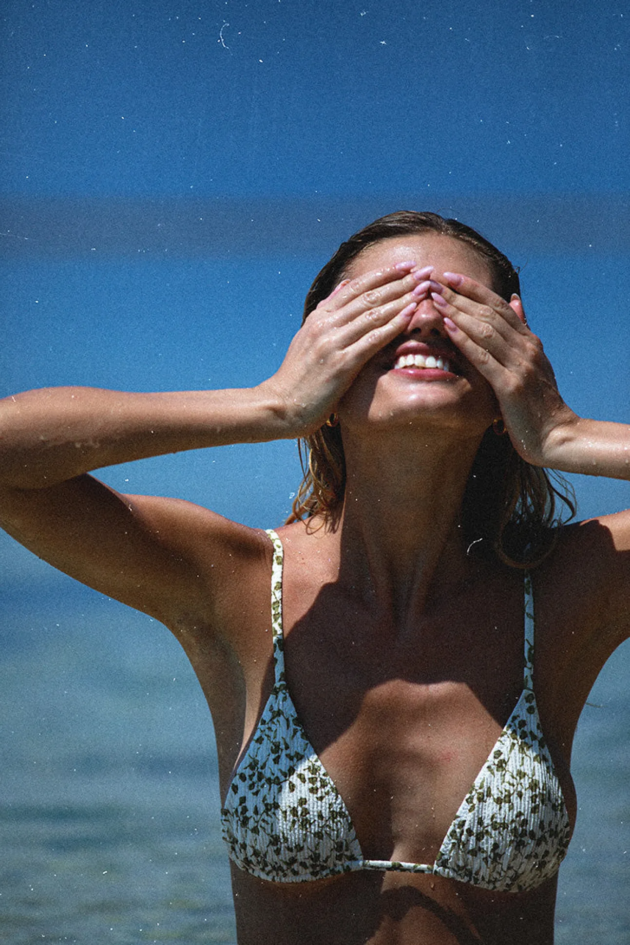 The Acacia Top is our classic triangle style in our exclusive Fleur print. Designed with adjustable straps and a tie-back closure, allowing you to adjust the fit to your liking. The perfect tanning essential.